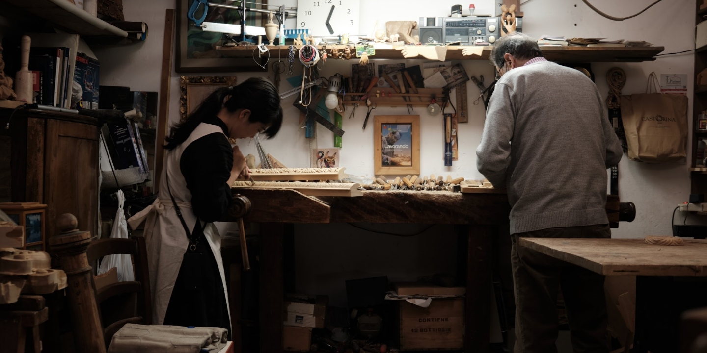 イタリアフィレンツェに渡り木彫家Gustavo Cavarello 他、額縁工Bottega d’arte Maserri,額縁修復工房Julia Markertなどの工房で額縁彫刻やヨーロッパ古典技法額縁について学ぶ